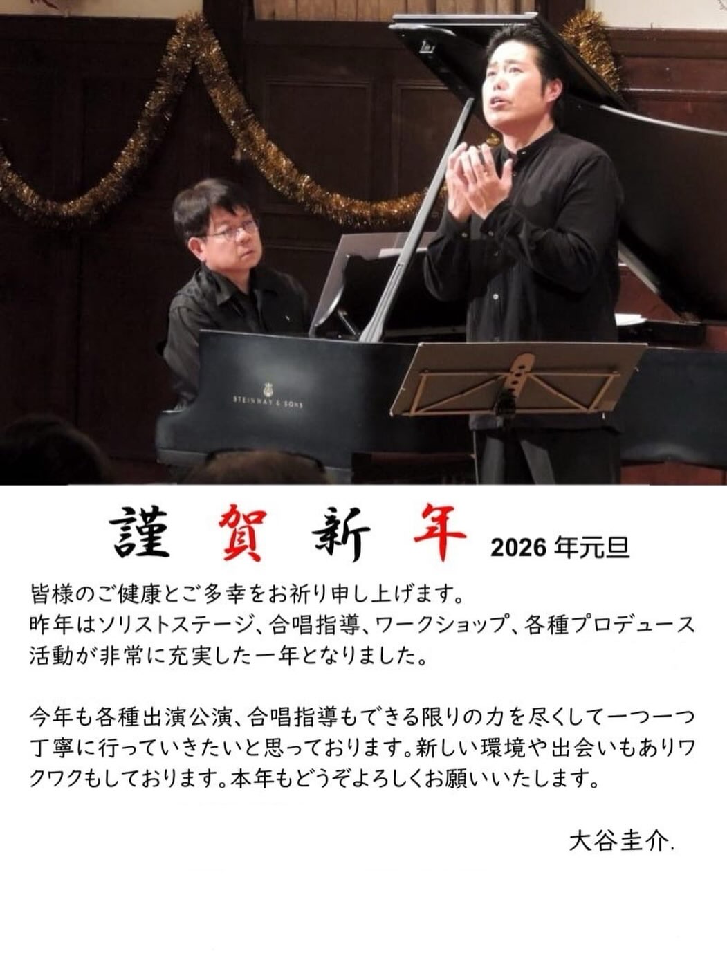 本年、バリトン歌手としての私は、さらに一層の研鑽を積み、表現の深奥を追い求めていきたいと考えています。声という、肉体に宿る最も根源的な楽器を通じて、作品が内包する真実をいかに純粋に紡ぎ出すか。技術的な熟達の先にある、聴き手の心の琴線に触れるような、魂の昇華としての音楽を届けること。それが、この道を歩む者としての変わらぬ責務であります。